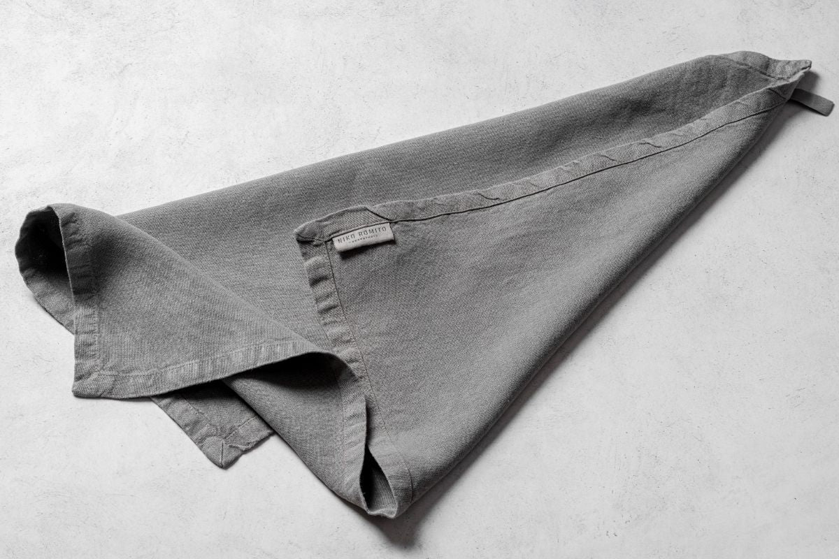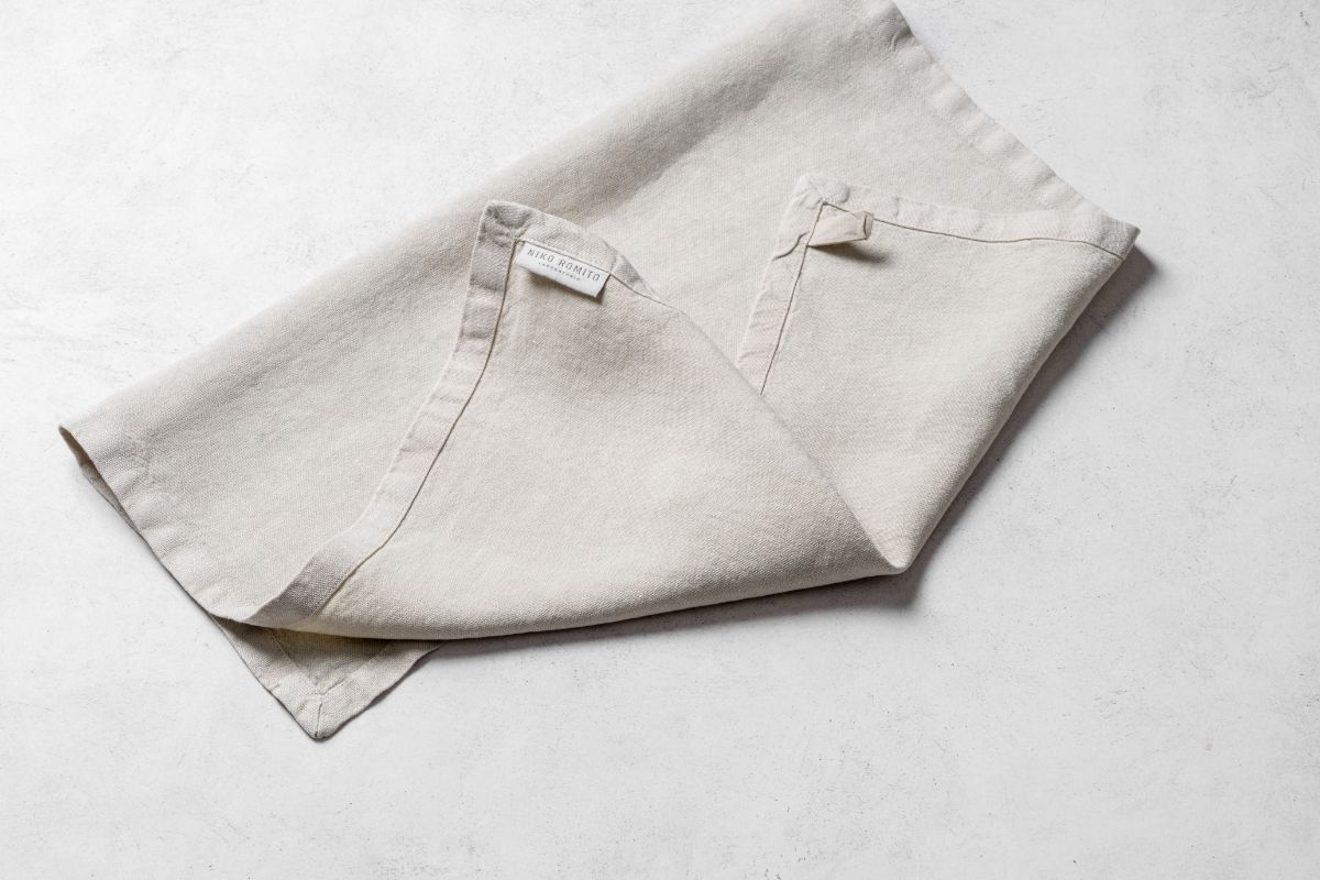 Bon, l’asciugapiatti in lino froissè finito da un’asola in cotone per appenderlo facilmente in cucina.